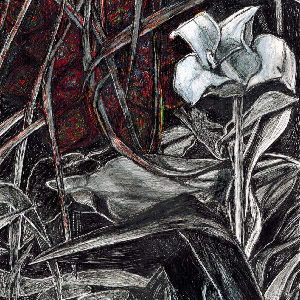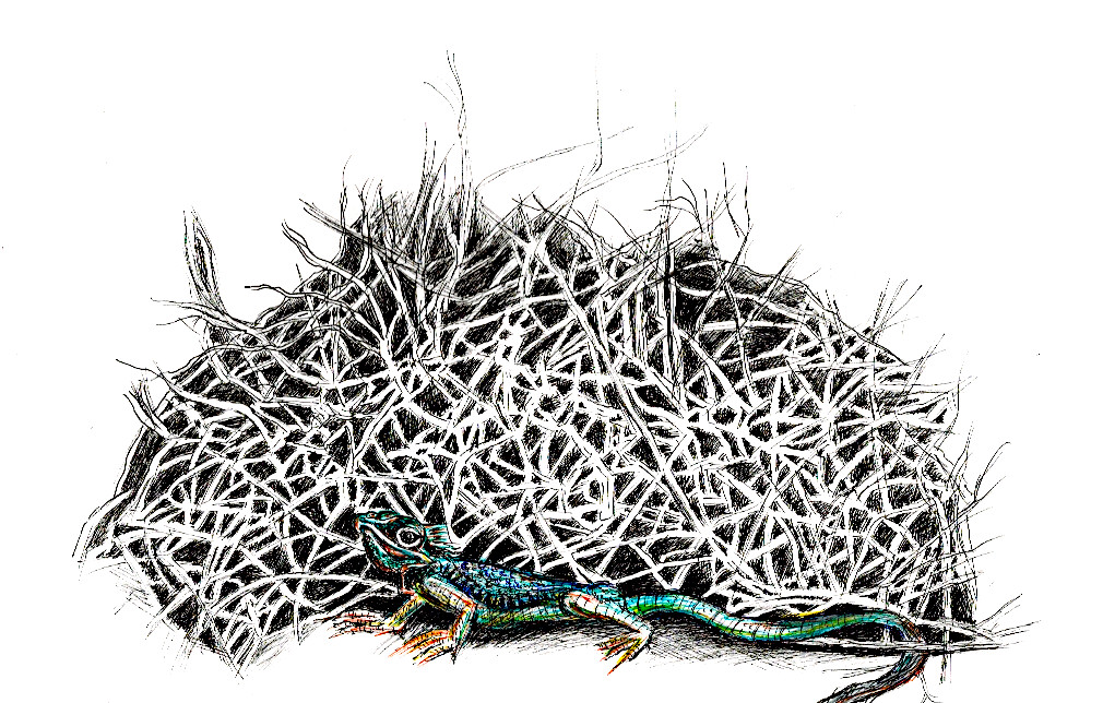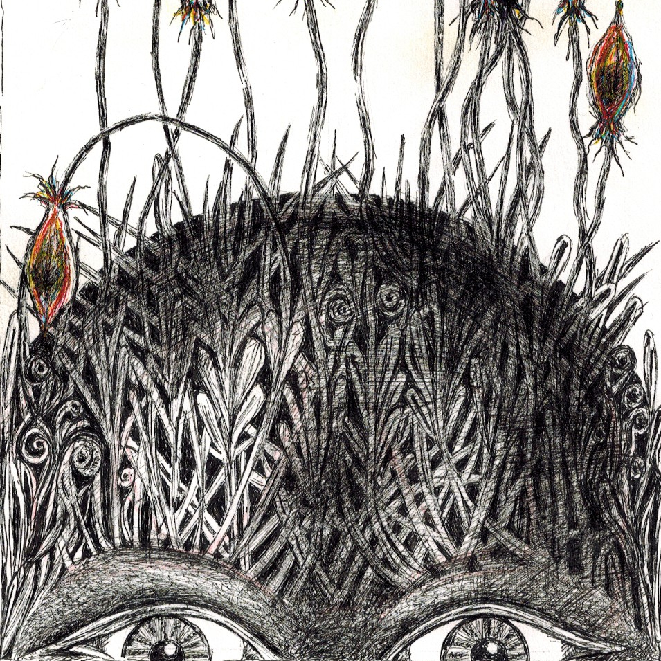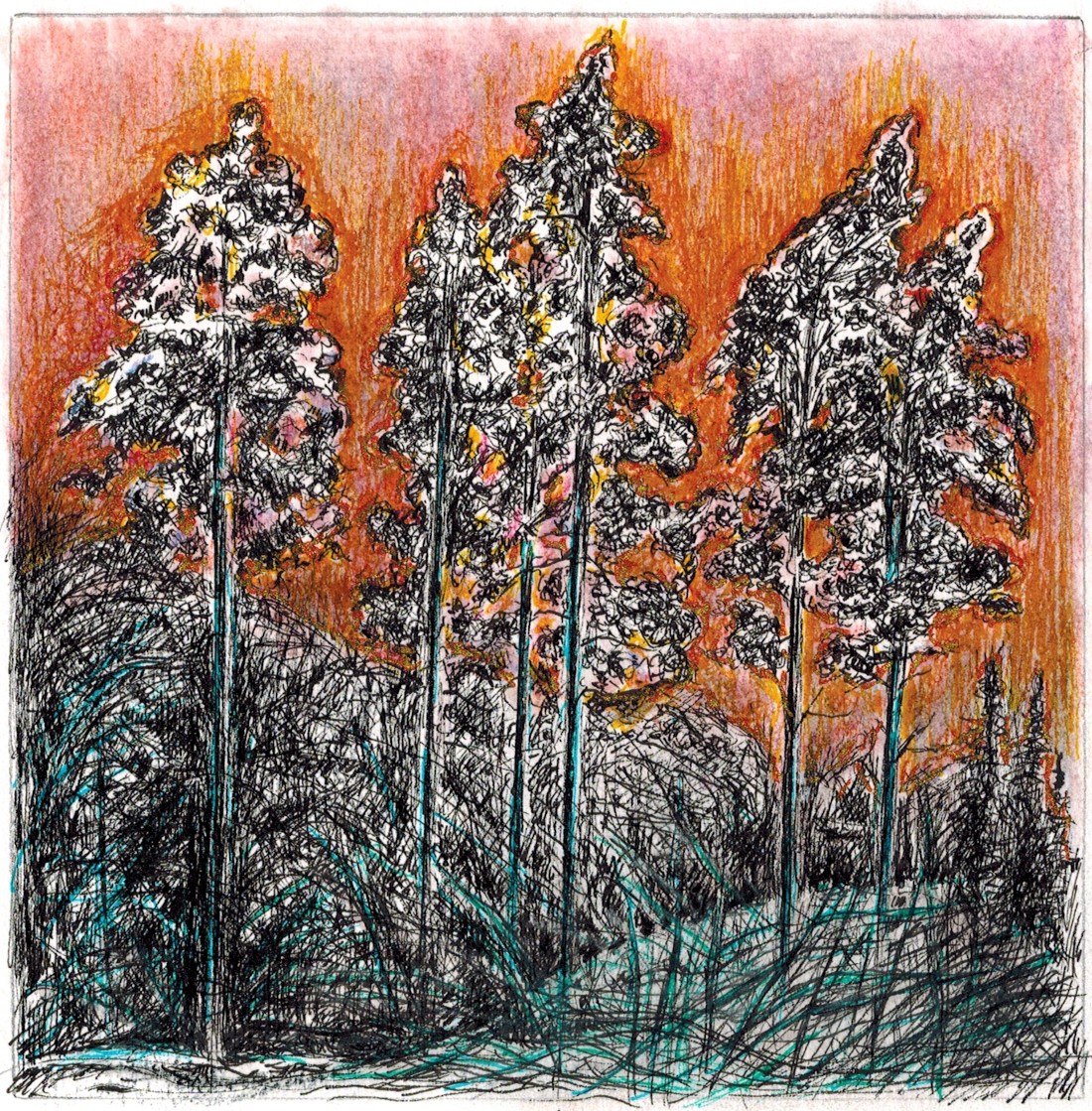 En sten, en stubbe, krokiga och knotiga träd, löv och blommor.