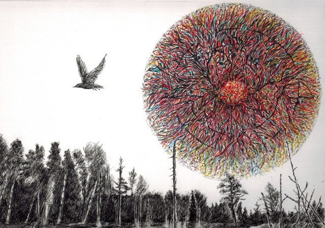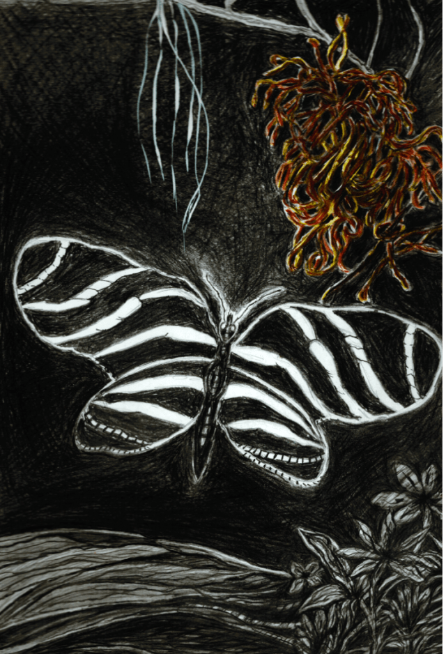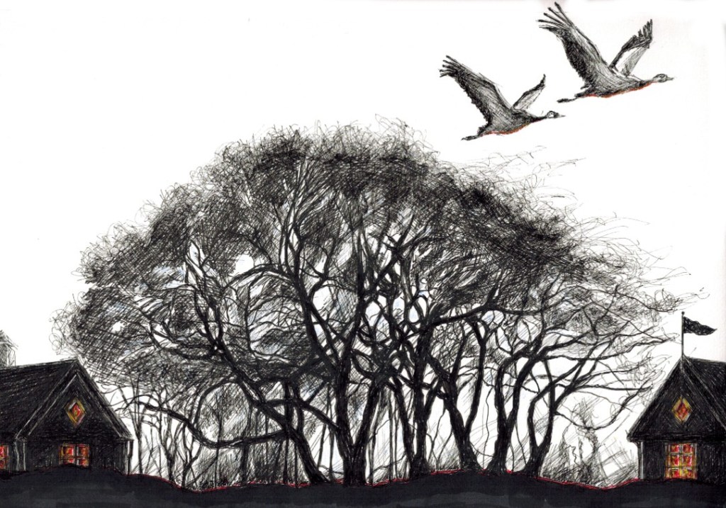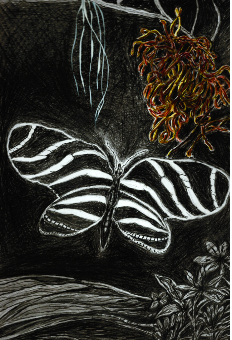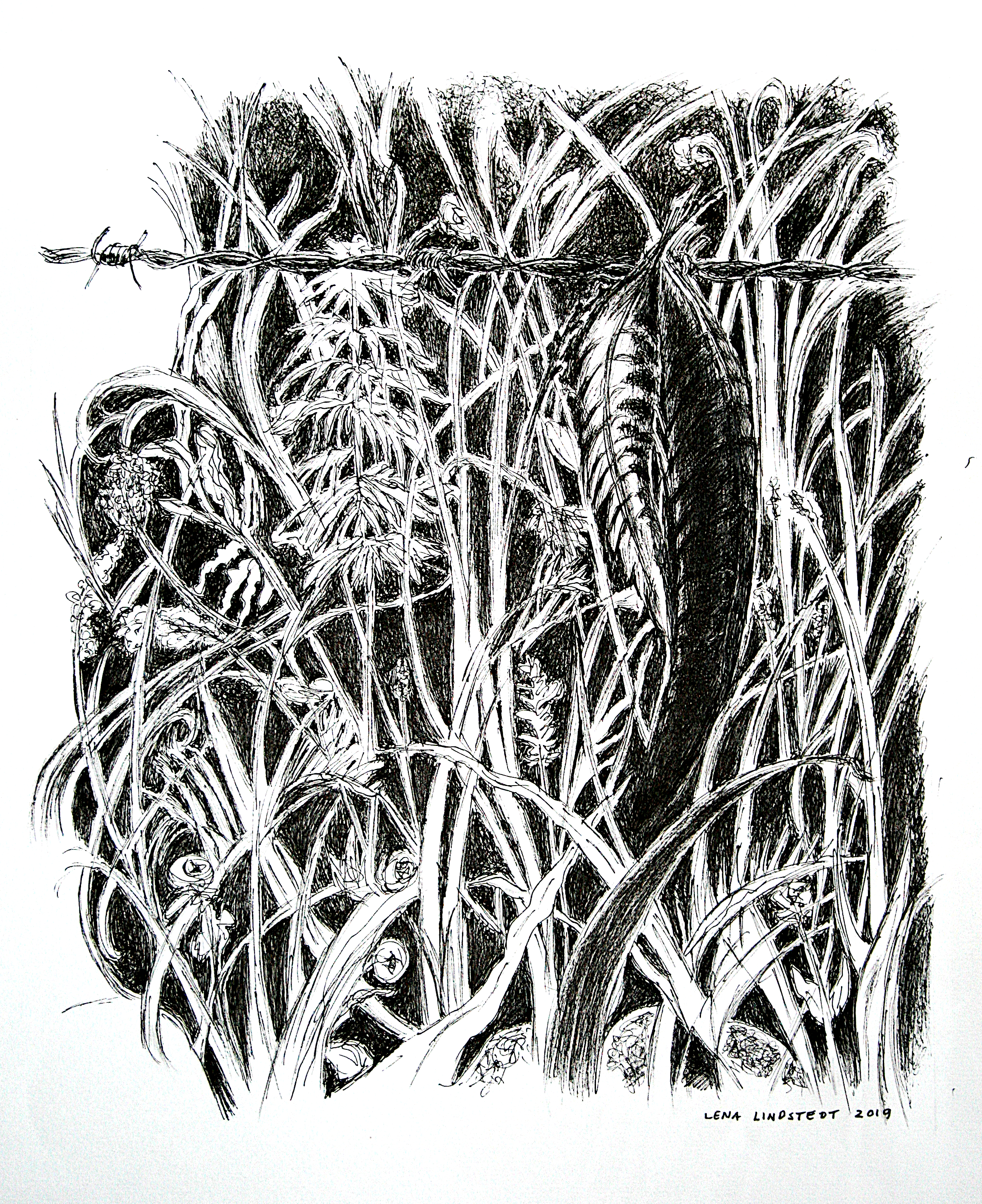 Natur Teckningen föreställer ett oroande vackert eldklotsom svävar över ett stilla landskap. Tranorna flyger över Usträngsbo Lagat och lappat är det gamla trädet En blyertsteckning med en svartvit fjäril inspirerad av min kusin Margarethas facebookbild från sin trädgård i Miami, Florida. Två fjädrar hade fastnat i kohagens taggtråd. Vad hade hänt?